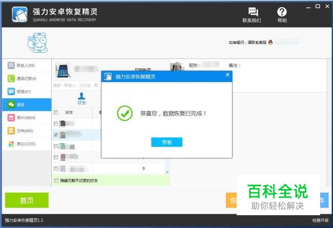 选择左侧“微信”进入界面后,点击勾选要恢复微信删除聊天记录的好友,并点击“恢复选中文件”将其导出到电脑即可完成安卓微信恢复