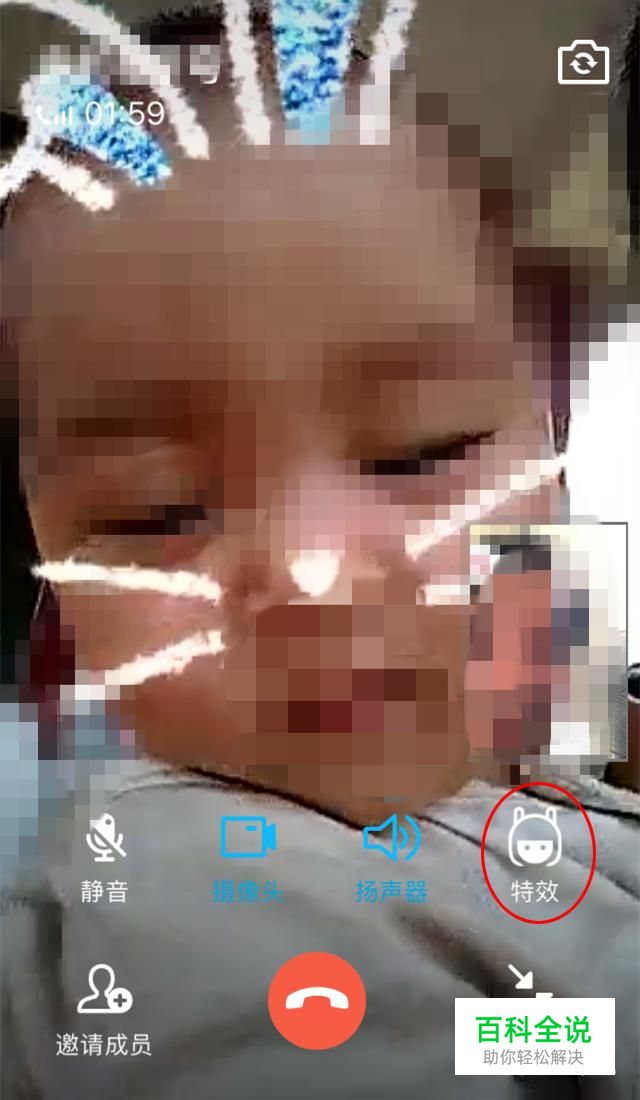 QQ视频电话接通后,可以看到右下方有“特效”两个字。