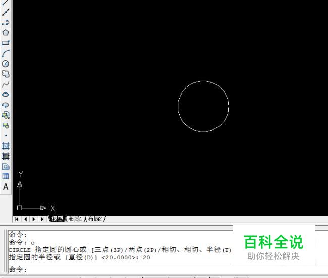 画一个半径20的圆,你也可以画其他半径,画圆快捷键C,随便选一个点为圆心,输入半径20,空格或者回车,完成圆的绘制。