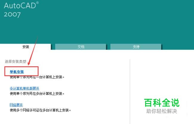 首先我们可以借助CAD2007光盘或者从网上下载CAD2007安装包进行安装。当电脑桌面弹出CAD2007安装界面后,首先点击页面中的“单机安装”按键。