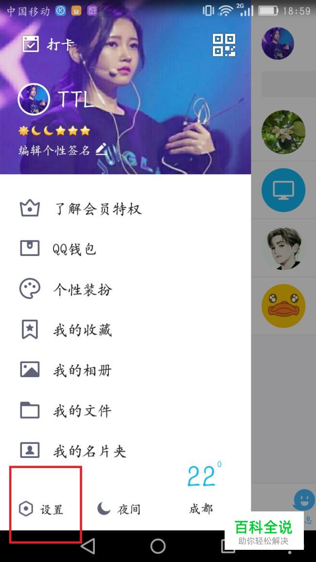 打开手机QQ,向右滑动,找到左下方的设置并进入。