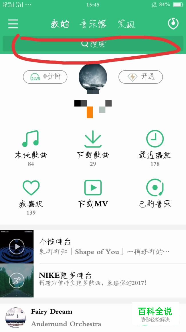 打开QQ音乐app,进入到软件的主页面,并看到上方搜索字样的格子。