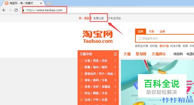 第一步:在浏览器地址栏输入网址:www.taobao.com,然后点击"免费注册”按钮。