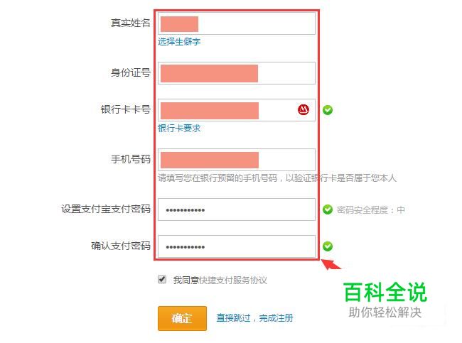 第五步:填写“真实姓名”、“身份证号”、“银行卡号”和“支付宝支付密码”。