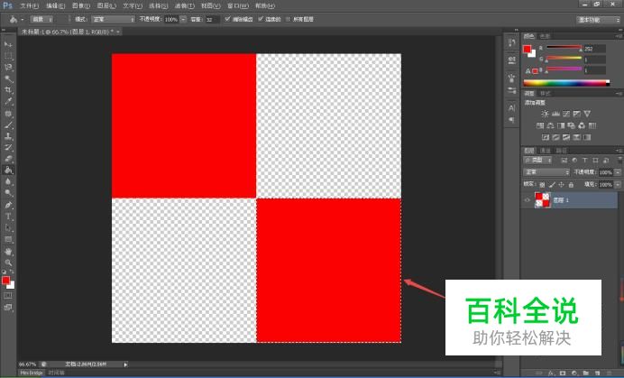 在工具栏中选取“矩形选框工具”,把选项栏的“样式”定为“固定大小”,宽度和高度根据新建图层的一半数值进行设置,然后点击画面,生成选区;