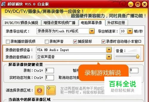 设置音频端口,边录视频边录声音 如下图所示,如果需要录制声音,那在“录像的音频设备”处选择你的声卡名称,在“录像的音频端口”处选择正确的端口进行录制即可。你可以录制游戏中的战斗声音,还可以录制自己的解说,非常方便的。