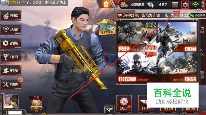 首先,登录穿越火线手游,点击游戏大厅右上角的“设置”选项。