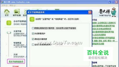 “更多节能降温选项”里面,可以设置自动启用节能墙纸与关闭屏幕保护的选项。什么是节能墙纸?为何要关闭屏保?鲁大师官网有相关文稿进行单独的说明。