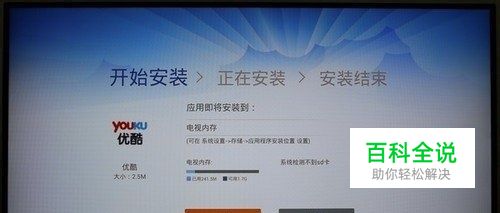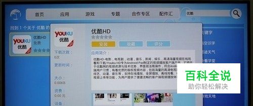 安装步骤如下: 1、在电脑上下载优酷tv版apk文件; 2、找一张空白的SD卡插入电视机; 3、点击电视自带的电视卫士,点击软件管理,SD卡自动生成TVManager\backup文件夹; 4、将电脑端下载的安卓应用软件(如优酷的TV、机顶盒版)放在该文件夹中,插入电视机; 5、点击电视卫士-软件管理,就可以看到应用软件; 6、点恢复操作,在电视机桌面就可以看到安装的应用了,可以运行那么最后一种方式就是直接在电视上的应用商店进行下载。 点击安装按钮,直接到下一步。 这就是安装成功了,我们就可以放心的使用了。