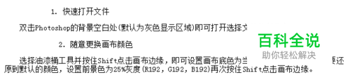 1. 快速打开文件 双击Photoshop的背景空白处(默认为灰色显示区域)即可打开选择文件的浏览窗口。 2. 随意更换画布颜色 选择油漆桶工具并按住Shift点击画布边缘,即可设置画布底色为当前选择的前景色。如果要还原到默认的颜色,设置前景色为25%灰度(R192,G192,B192)再次按住Shift点击画布边缘。