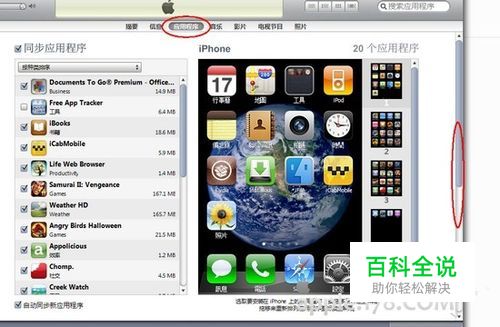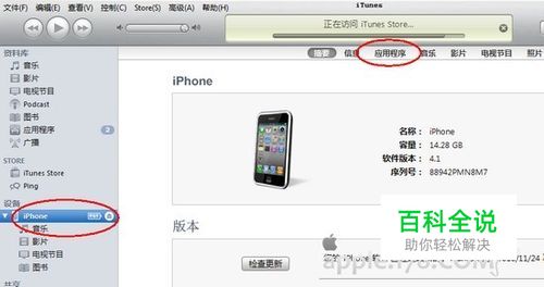 打开iTunes,将iPhone连接电脑,在iTunes中选择iPhone项,然后点击图示位置的“应用程序”。