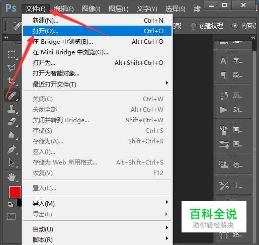 首先,打开PhotoShop软件,点击文件菜单,在弹出的命令中选择打开。