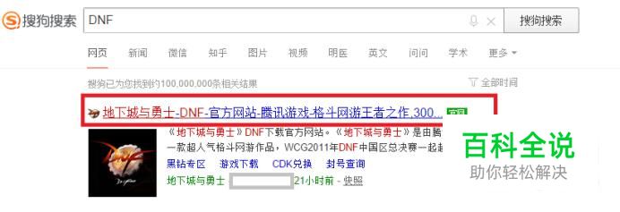 首先,使用搜狗搜索“DNF”,在搜索结果中,点击进入带有“官网”标识的网站。