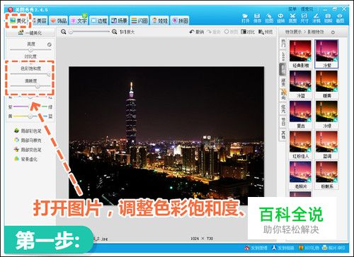 在软件下打开待处理的夜景图,在“美化”菜单下,将图片的色彩饱和度和清晰度调高,让色彩更加饱满鲜亮。