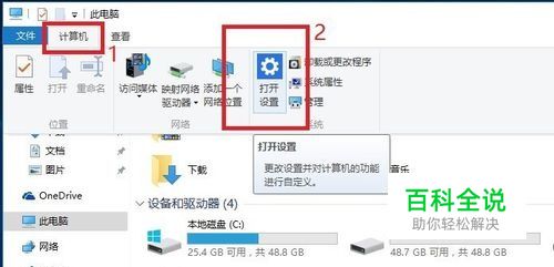 在桌面双击打开”此电脑“后,按图所示先点击”计算机“,然后再弹出的下拉菜单中点击打开”打开设置“选项。