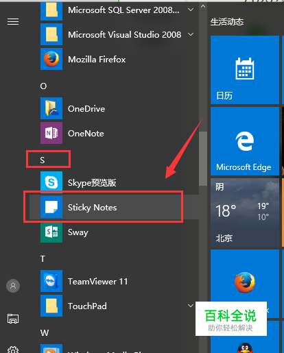 再开始菜单中,找到 Sticky Notes。