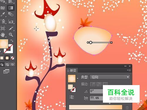 4.在窗口菜单中,选择【符号库】【自然】选择枫叶,在属性栏中【断开链接】选中一个枫叶,做三次,右键,取消编组;填充①#e22506②#fc6d00;渐变滑块:50%的位置。径向渐变。按G,拖动如图样式。