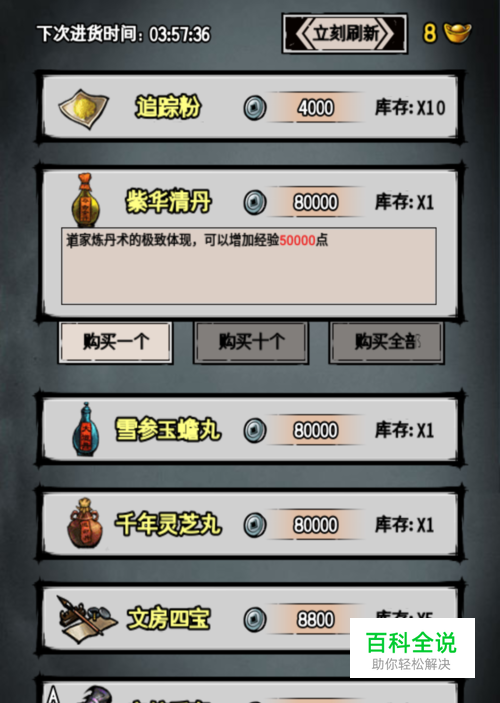 最后在这里为大家列出只能通过购买获得的丹药,这类丹药无法自己制作,只能通过购买,大多存在于聚宝阁内,也有少部分在武当炼丹房购买。 聚宝阁: 【龙虎丹】服用后永久增加攻击1%,最多服用30颗。 【子午万寿丹】服用后永久增加气血2%,最多服用30颗。 【邀月丹】服用后永久增加速度1点,最多服用30颗。 【九花玉露丸】服下后立刻恢复内伤。 【雪参玉蟾丸】增加阅历20000点。 【千年灵芝丸】增加修为64点。 武当派炼丹房: 【紫华清丹】增加经验50000点,售价80000两。 【雪参玉蟾丸】增加阅历20000点,售价80000两。 【千年灵芝丸】增加修为64点,售价80000两。