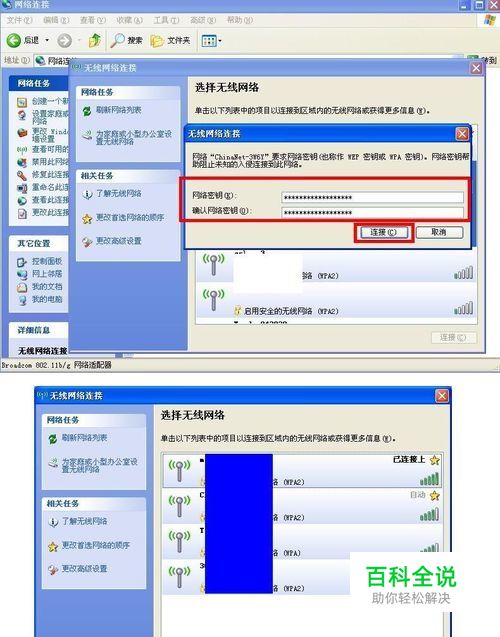 打开要连接的无线网络名称之后 ,就会要求输入密码,分别输入两次密码之后,点击:连接,这时就会自动验证,验证通过之后就连接上了。