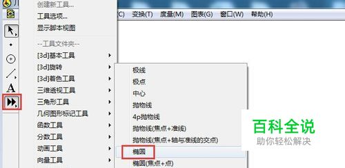 圆锥定义演示动画的制作。分三步完成:先画圆锥,再画出直角三角形,然后定义动画。打开几何画板,单击自定义工具,选择圆锥曲线,单击椭圆选项。