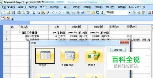 步骤3、在弹出的报表窗口中,对报表进行了分类,比如“成本”、“工作分配”、“工作量”等等;