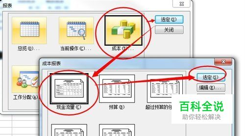 步骤4、比如小编鼠标左键点击“成本(T)…”图标,然后继续鼠标左键点击”选定“按钮将弹出”成本报表“窗口,再次用鼠标左键点击你所希望生成的成本报表类型,比如小编点击“现金流量(C),然后点击右方的“选定(S)”按钮,将生成如下图所示报表;