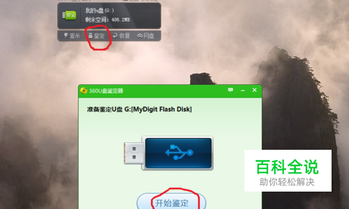 将U盘插入电脑,电脑上装有360U盘鉴定软件的直接会弹出U盘信息,点击鉴定,然后点开始鉴定,如图,如果是缩水U盘就会马上鉴定出来。