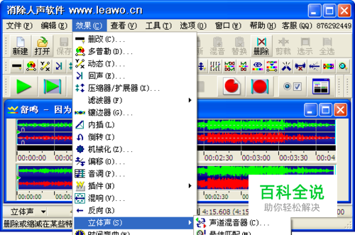 来,选择菜单“效果”-“立体声”-“消减人声”。