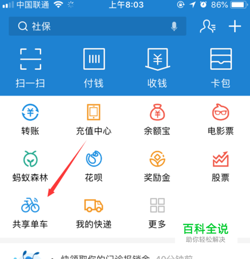 首先,我们点击打开支付宝首页,然后点击共享单车进入共享单车页面