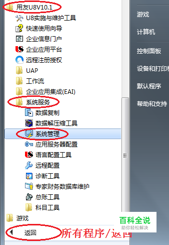 在已经成功安装软件的计算机上,按以下顺序单击以启动“系统管理”:“开始”→“所有程序”(以Windows7为例,WindowsXP则点击“程序”)→“用友U8V10.1” →“系统服务”→“系统管理”。