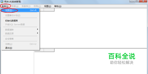 在弹出的“用友U8[系统管理]”窗口中单击菜单栏中的“系统”选项,在下级菜单中单击“注册”。