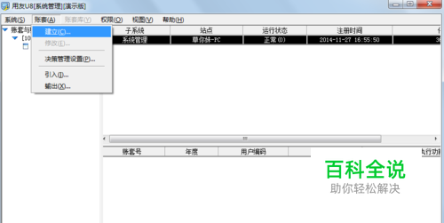 如图,若需要建立账套、引入和输出账套则在“账套”菜单中进行操作。(建立账套的方法将在本系列第3篇经验中详细介绍)