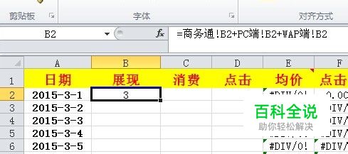 第二步:在“总体”表格展现栏中,输入:=商务通!B2+PC端!B2+WAP端!B2按回车键(excle表单+感叹号+具体的单元格)