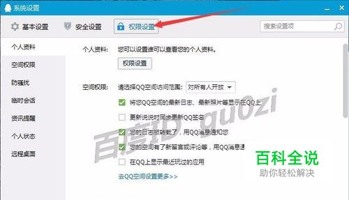 在打开的QQ系统设置对话框中, 点击 权限设置,继续操作