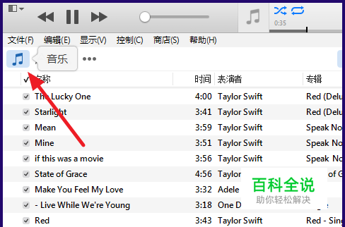 打开iTunes,点击左上角的【♬】图标,切换到音乐