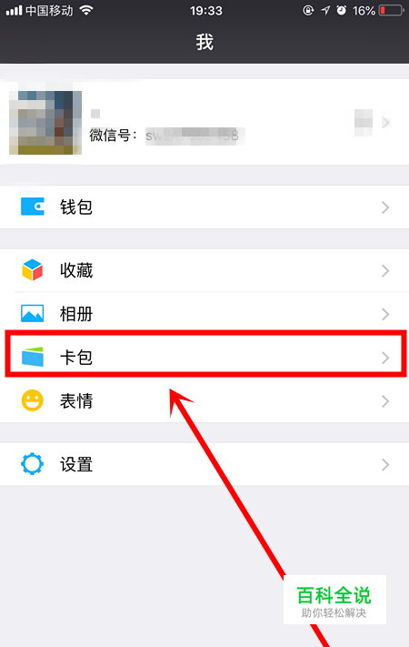 手机打开微信,点击右下角“我”,找到“卡包”,点击打开。