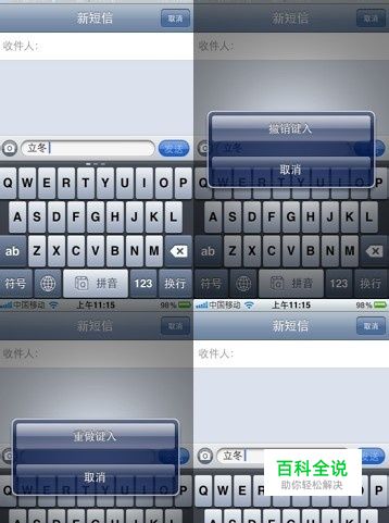 iphone技巧ˇ编写短信的时候,如果想把写的内容全删掉,只需晃动你的iphone几下,会弹出个窗口,选择“撤销键入”就可把内容全删掉了,不用按着删除键半天了。如果想把刚删掉的内容恢复,晃动iphone选择“重做键入”,刚删掉的内容就回来了;如果是刚粘贴过来的,晃动可以“撤销粘贴”。!!!