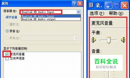 点击“选项”-“属性” 点击选择混音器为Audio Input,勾选“麦克风音量”,点击确定保存。然后在麦克风音量处拖动音量大小,勾选“选择”