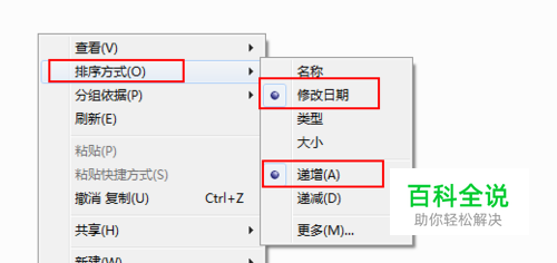 右键点击文件夹空白处,选择 排序方式-> 修改日期 递增,如图: