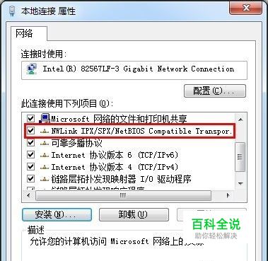 在打开的”本地连接 属性”窗口中点击“安装”按钮,在弹出窗口中选择“协议”并点击“添加”,然后在弹出的“添加网络协议”窗口中选择“Microsoft”公司下的“IPX/SPX”协议,最后点击“确定”进行安装。安装完成后就会发现IPX协议已存在于协议列表中。