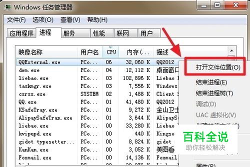 删掉QQexternal.exe的方法非常多,最简单的一种就是直接搜索这个文件再干掉。以下的举例是如何删掉QQexternal.exe的常用方法之一。 第一步,在Win7里按“Ctrl+Shift+Esc ”快速打开任务管理器(XP的快捷键为Ctrl+Alt+Delete),然后在进程那里找到QQexternal.exe后点击右键选择“打开文件位置”