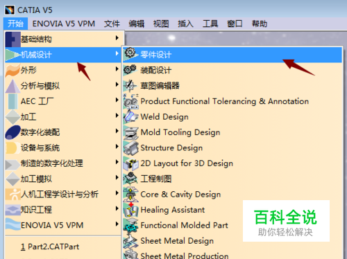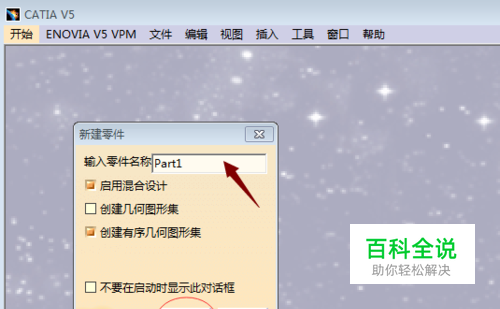 首先打开Catia三维制图软件,点击开始,选择机械设计命令,在弹出的对话框里选择零件设计,弹出新建零件对话框,设置好零部件名字就可以点击确定进入到操作页面。