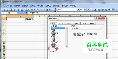 2、在弹出的“单元格格式”对话框中“数字”下面的的“分类”里面选择“自定义”;