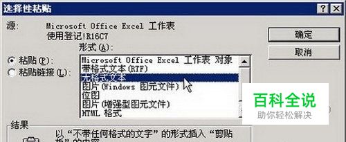 方法2:当Word文档中的数据来源于Excel工作表中的某个单元格时,可以首先在Excel工作表中复制该单元格,然后在Word文档中依次单击“编辑”→“选择性粘贴”菜单命令,打开“选择性粘贴”对话框。在“形式”列表中选中“无格式文本”选项,并单击“确定”按钮。这样操作可以既保持与数据源的链接,又能与Word文档格式融为一体。如果数据源有格式特别是有上下标时,可以选择“带格式文本(RTF)”选项,如图2007110706所示。 图2007110706 无格式文本
