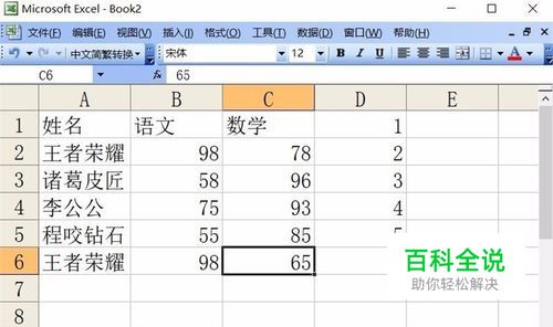 如果一行数据只有前几项重复又怎么办呢? 比如我们把重复行的数学成绩改为65。 我们先在D列依次输入1到6。