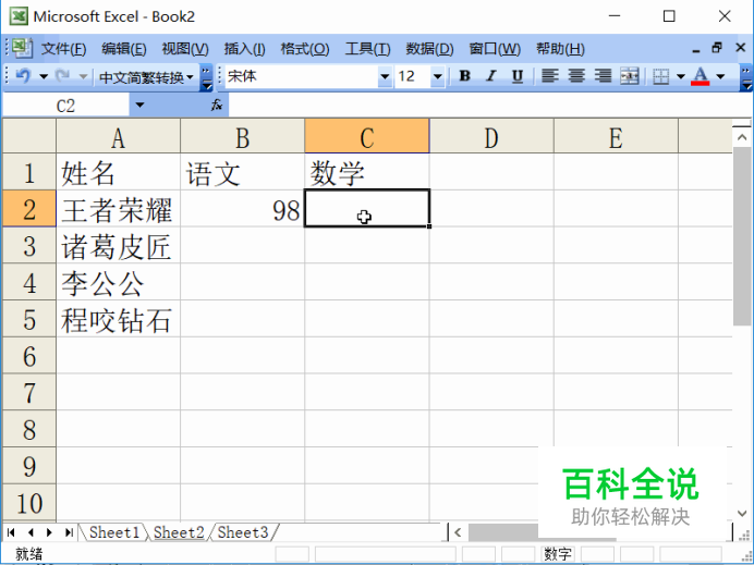 打开Excel2003,为了便于说明,我们先设置样表。样表中有一行重复。