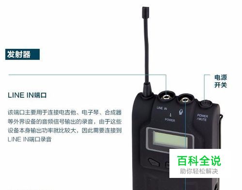 现在来介绍下无线麦克风的发射器端 LINE IN端口 该端口主要用于连接电吉他,电子琴,合成器等外界设备的音频信号输出的录音,犹豫这些设备本身输出功率就比较大,因此需要连接到LINE IN端口录音