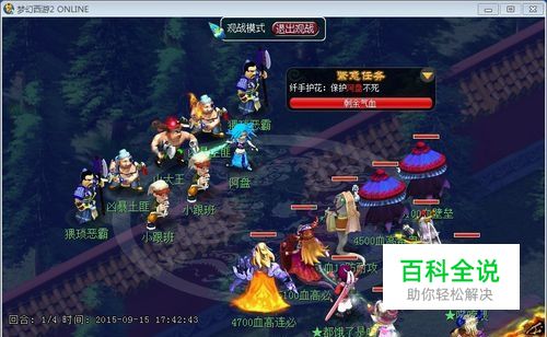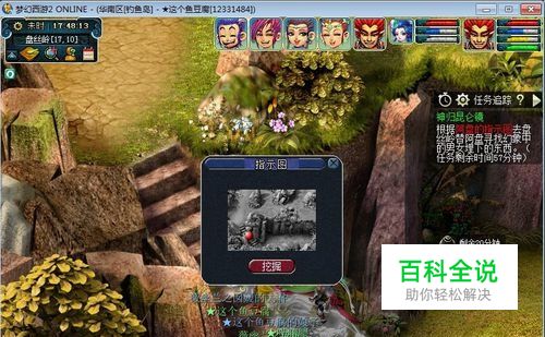 到达途中标注位置,右键点击,挖掘。触发第二场战斗 第二场战斗,难度★。 1.紧急任务,保持全体玩家气血大于30%,没什么好说的,加血的事呗。 2.主怪魔王,四个娃娃是HS,前排随即法系。娃娃会不停的叽叽歪歪(秒人200左右伤害),前排单烧或群秒(群秒人物伤害400左右)。 3.主怪血量2.1W,后排娃娃血量2W,前排三法系小怪血量略少(我没看错的话,应该真的真的只有5000左右)。 4.击杀顺序,第一回合直接秒了主怪,第二回合清完前面三个法系。 战斗结束之后会让你去盘丝170.108.到达之后绕着“欢欢、乐乐、萌萌.......”三个NPC绕最多两圈可遇怪,开始第三场战斗。