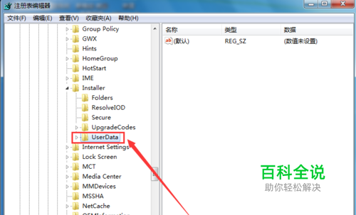 在左边列表中找到 HKEY_LOCAL_MACHINE\SOFTWARE\Microsoft\Windows\CurrentVersion\Installer\UserData,如图二