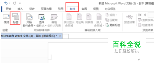 如下图所示,打开word之后,在上方的工具栏中找到邮件点击进入,然后在子工具栏中点击标签选项。